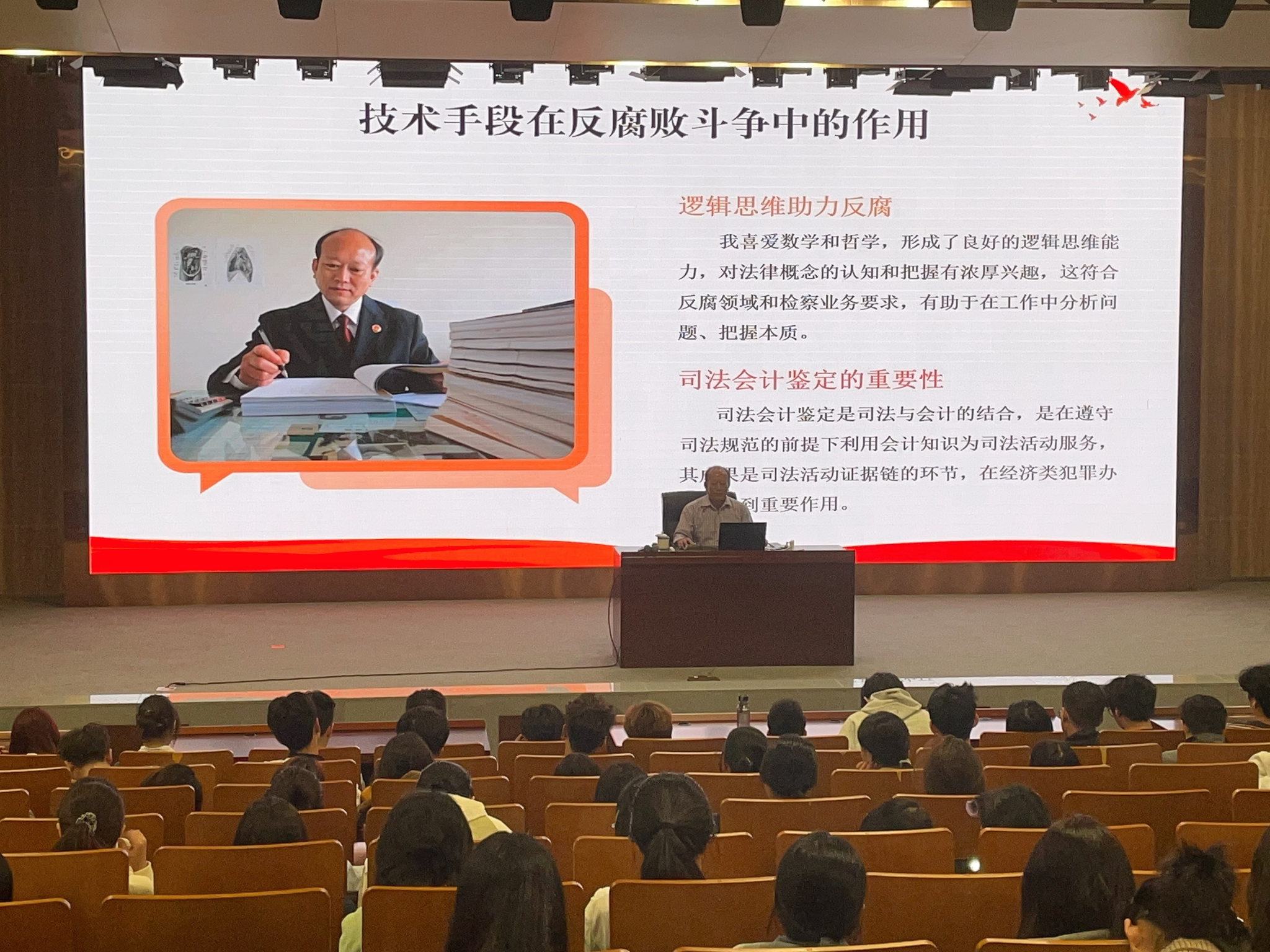 图书馆报告厅顺利举行。衢州市人民检察院三级高级检察官、浙江省检察业务专家、司法高级会计师金建文以“反腐金检 使命如磐”为题,为现场师生带来了一场具有专业深度与思想温度的精彩报告。