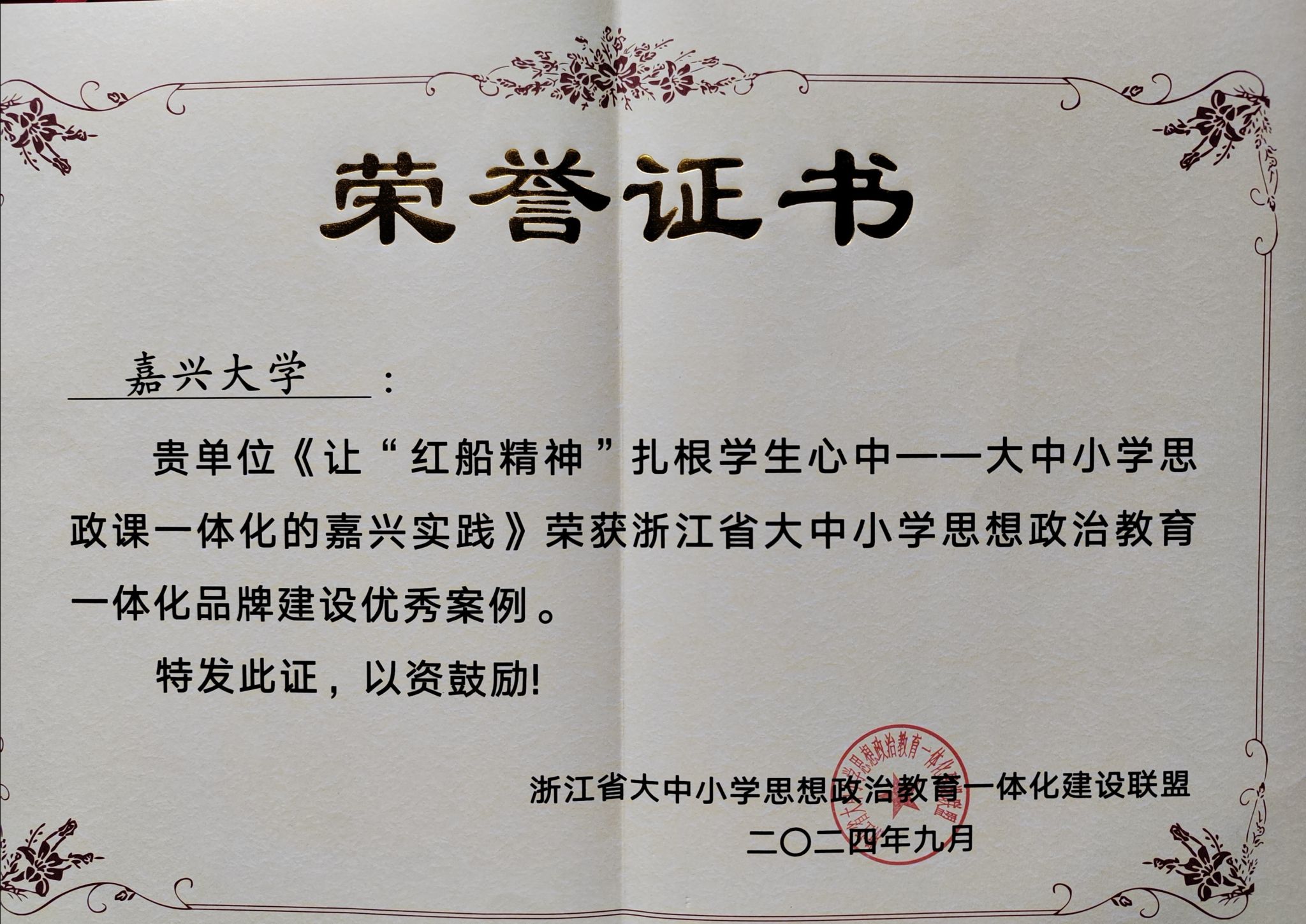 “嘉兴市大中小学思政课一体化研究中心”申报的案例《让“红船精神”扎根学生心中--大中小学思政课一体化的嘉兴实践》荣获了浙江省大中小学思想政治教育一体化品牌建设优秀案例。