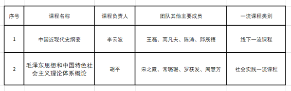 共有2门课程获得认定。其中《中国近现代史纲要》认定为省级线下一流课程,《毛泽东思想和中国特色社会主义理论体系概论》(实践)为省级社会实践一流课程。